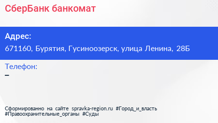 СберБанк, банкомат по адресу 671160, Бурятия, Гусиноозерск, улица Ленина, 28Б в дальнейшем Организация, размещена в следующих категориях: