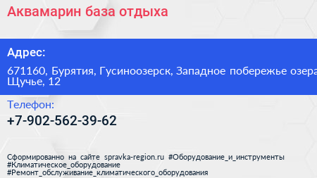 Аквамарин, база отдыха по адресу 671160, Бурятия, Гусиноозерск, Западное побережье озера Щучье, 12 в дальнейшем Организация, размещена в следующих категориях: