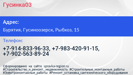 Гусинка03 по адресу Бурятия, Гусиноозерск, Рыбхоз, 15 в дальнейшем Организация, размещена в следующих категориях: