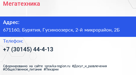 Мегатехника по адресу 671160, Бурятия, Гусиноозерск, 2-й микрорайон, 2Б в дальнейшем Организация, размещена в следующих категориях: