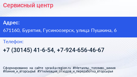 Сервисный центр по адресу 671160, Бурятия, Гусиноозерск, улица Пушкина, 6 в дальнейшем Организация, размещена в следующих категориях: