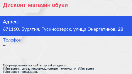 Дисконт, магазин обуви по адресу 671160, Бурятия, Гусиноозерск, улица Энергетиков, 28 в дальнейшем Организация, размещена в следующих категориях: