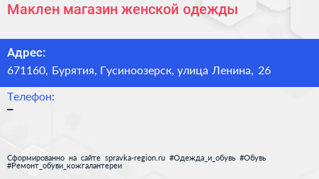 Маклен, магазин женской одежды по адресу 671160, Бурятия, Гусиноозерск, улица Ленина, 26 в дальнейшем Организация, размещена в следующих категориях: