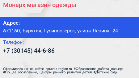 Монарх, магазин одежды по адресу 671160, Бурятия, Гусиноозерск, улица Ленина, 24 в дальнейшем Организация, размещена в следующих категориях: