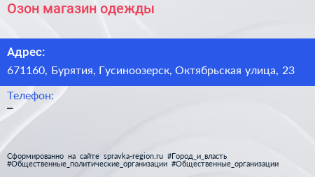 Озон, магазин одежды по адресу 671160, Бурятия, Гусиноозерск, Октябрьская улица, 23 в дальнейшем Организация, размещена в следующих категориях: