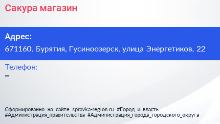 Сакура, магазин по адресу 671160, Бурятия, Гусиноозерск, улица Энергетиков, 22 в дальнейшем Организация, размещена в следующих категориях: