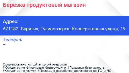 Берёзка, продуктовый магазин по адресу 671182, Бурятия, Гусиноозерск, Кооперативная улица, 19 в дальнейшем Организация, размещена в следующих категориях: