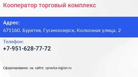 Кооператор, торговый комплекс по адресу 671160, Бурятия, Гусиноозерск, Колхозная улица, 2 в дальнейшем Организация, размещена в следующих категориях: