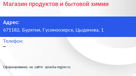 Магазин продуктов и бытовой химии по адресу 671182, Бурятия, Гусиноозерск, Цыденова, 1 в дальнейшем Организация, размещена в следующих категориях: