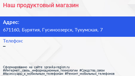 Наш, продуктовый магазин по адресу 671160, Бурятия, Гусиноозерск, Тухумская, 7 в дальнейшем Организация, размещена в следующих категориях: