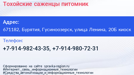 Тохойские саженцы, питомник по адресу 671182, Бурятия, Гусиноозерск, улица Ленина, 20Б киоск в дальнейшем Организация, размещена в следующих категориях: