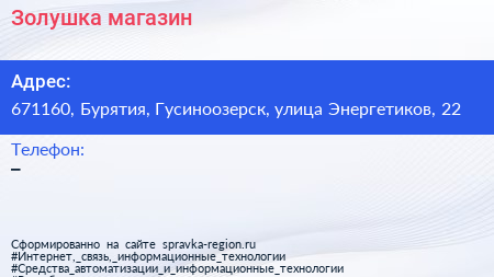 Золушка, магазин по адресу 671160, Бурятия, Гусиноозерск, улица Энергетиков, 22 в дальнейшем Организация, размещена в следующих категориях: