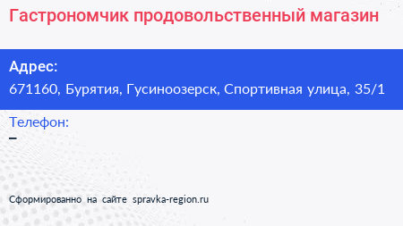 Гастрономчик, продовольственный магазин по адресу 671160, Бурятия, Гусиноозерск, Спортивная улица, 35/1 в дальнейшем Организация, размещена в следующих категориях:
