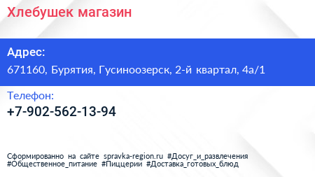 Хлебушек, магазин по адресу 671160, Бурятия, Гусиноозерск, 2-й квартал, 4а/1 в дальнейшем Организация, размещена в следующих категориях: