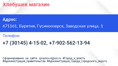 Хлебушек, магазин по адресу 671161, Бурятия, Гусиноозерск, Заводская улица, 1 в дальнейшем Организация, размещена в следующих категориях: