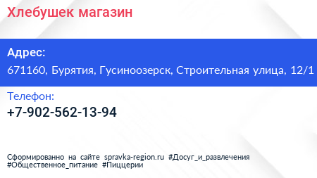 Хлебушек, магазин по адресу 671160, Бурятия, Гусиноозерск, Строительная улица, 12/1 в дальнейшем Организация, размещена в следующих категориях: