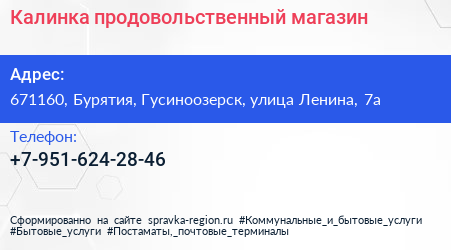 Калинка, продовольственный магазин по адресу 671160, Бурятия, Гусиноозерск, улица Ленина, 7а в дальнейшем Организация, размещена в следующих категориях: