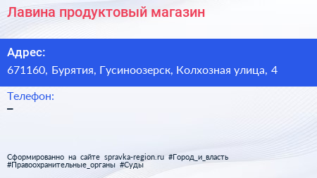 Лавина, продуктовый магазин по адресу 671160, Бурятия, Гусиноозерск, Колхозная улица, 4 в дальнейшем Организация, размещена в следующих категориях: