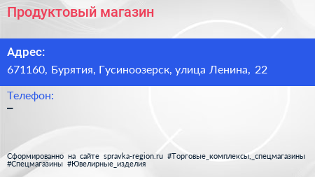 Продуктовый магазин по адресу 671160, Бурятия, Гусиноозерск, улица Ленина, 22 в дальнейшем Организация, размещена в следующих категориях: