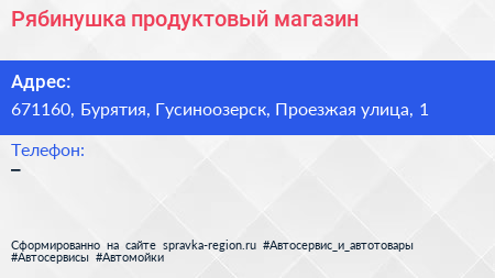 Рябинушка, продуктовый магазин по адресу 671160, Бурятия, Гусиноозерск, Проезжая улица, 1 в дальнейшем Организация, размещена в следующих категориях: