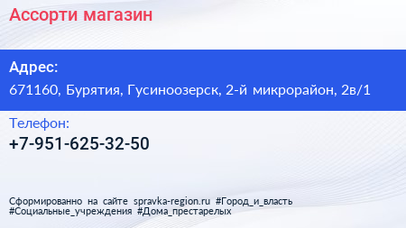 Ассорти, магазин по адресу 671160, Бурятия, Гусиноозерск, 2-й микрорайон, 2в/1 в дальнейшем Организация, размещена в следующих категориях: