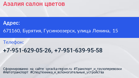 Азалия, салон цветов по адресу 671160, Бурятия, Гусиноозерск, улица Ленина, 15 в дальнейшем Организация, размещена в следующих категориях: