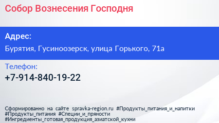 Собор Вознесения Господня по адресу Бурятия, Гусиноозерск, улица Горького, 71а в дальнейшем Организация, размещена в следующих категориях: