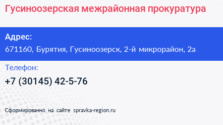 Гусиноозерская межрайонная прокуратура по адресу 671160, Бурятия, Гусиноозерск, 2-й микрорайон, 2а в дальнейшем Организация, размещена в следующих категориях: