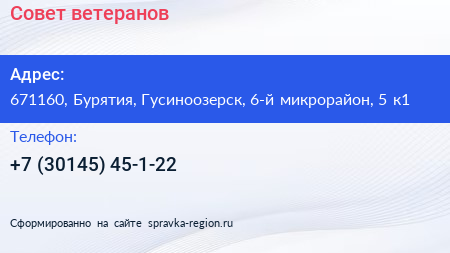 Совет ветеранов по адресу 671160, Бурятия, Гусиноозерск, 6-й микрорайон, 5 к1 в дальнейшем Организация, размещена в следующих категориях: