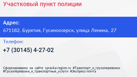 Участковый пункт полиции по адресу 671182, Бурятия, Гусиноозерск, улица Ленина, 27 в дальнейшем Организация, размещена в следующих категориях:
