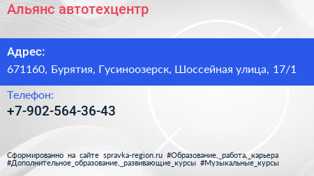 Альянс, автотехцентр по адресу 671160, Бурятия, Гусиноозерск, Шоссейная улица, 17/1 в дальнейшем Организация, размещена в следующих категориях: