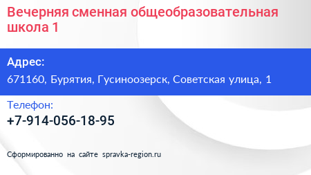 Вечерняя сменная общеобразовательная школа №1 по адресу 671160, Бурятия, Гусиноозерск, Советская улица, 1 в дальнейшем Организация, размещена в следующих категориях: