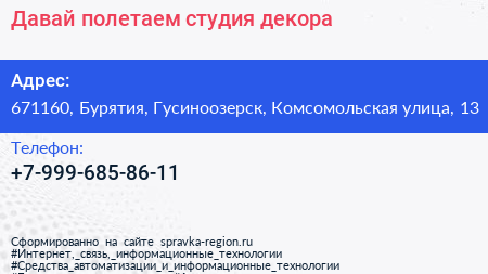Давай полетаем, студия декора по адресу 671160, Бурятия, Гусиноозерск, Комсомольская улица, 13 в дальнейшем Организация, размещена в следующих категориях: