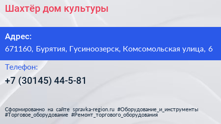 Шахтёр, дом культуры по адресу 671160, Бурятия, Гусиноозерск, Комсомольская улица, 6 в дальнейшем Организация, размещена в следующих категориях: