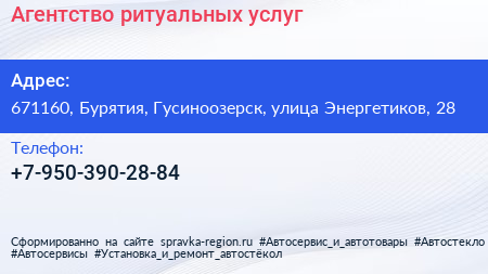 Агентство ритуальных услуг по адресу 671160, Бурятия, Гусиноозерск, улица Энергетиков, 28 в дальнейшем Организация, размещена в следующих категориях:
