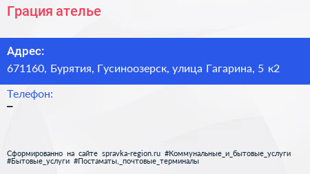 Грация, ателье по адресу 671160, Бурятия, Гусиноозерск, улица Гагарина, 5 к2 в дальнейшем Организация, размещена в следующих категориях: