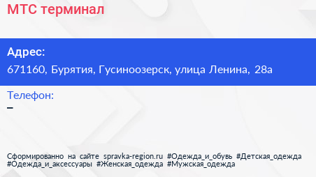 МТС, терминал по адресу 671160, Бурятия, Гусиноозерск, улица Ленина, 28а в дальнейшем Организация, размещена в следующих категориях:
