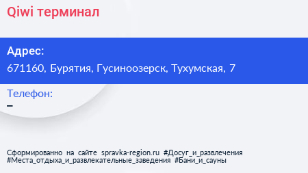 Qiwi, терминал по адресу 671160, Бурятия, Гусиноозерск, Тухумская, 7 в дальнейшем Организация, размещена в следующих категориях: