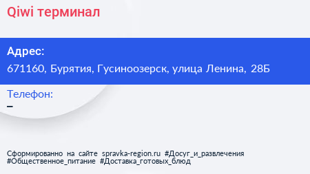 Qiwi, терминал по адресу 671160, Бурятия, Гусиноозерск, улица Ленина, 28Б в дальнейшем Организация, размещена в следующих категориях: