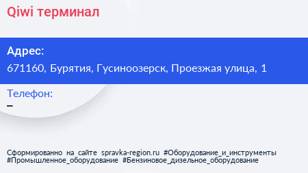 Qiwi, терминал по адресу 671160, Бурятия, Гусиноозерск, Проезжая улица, 1 в дальнейшем Организация, размещена в следующих категориях: