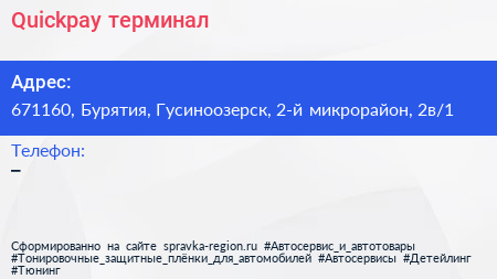 Quickpay, терминал по адресу 671160, Бурятия, Гусиноозерск, 2-й микрорайон, 2в/1 в дальнейшем Организация, размещена в следующих категориях: