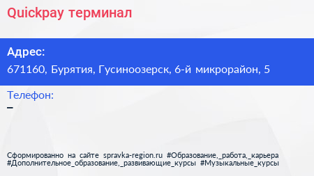 Quickpay, терминал по адресу 671160, Бурятия, Гусиноозерск, 6-й микрорайон, 5 в дальнейшем Организация, размещена в следующих категориях:
