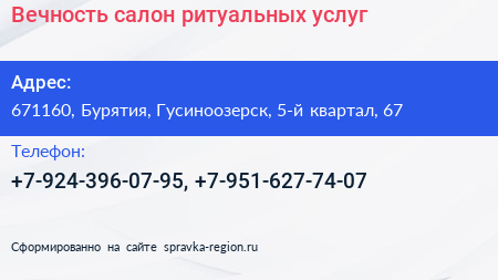 Вечность, салон ритуальных услуг по адресу 671160, Бурятия, Гусиноозерск, 5-й квартал, 67 в дальнейшем Организация, размещена в следующих категориях: