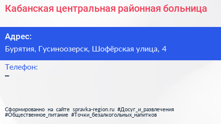 Кабанская центральная районная больница по адресу Бурятия, Гусиноозерск, Шофёрская улица, 4 в дальнейшем Организация, размещена в следующих категориях: