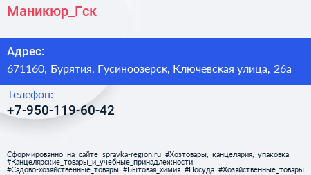 Маникюр_Гск по адресу 671160, Бурятия, Гусиноозерск, Ключевская улица, 26а в дальнейшем Организация, размещена в следующих категориях: