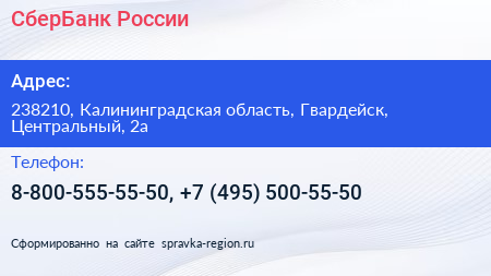 СберБанк России по адресу 238210, Калининградская область, Гвардейск, Центральный, 2а в дальнейшем Организация, размещена в следующих категориях: