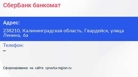 СберБанк, банкомат по адресу 238210, Калининградская область, Гвардейск, улица Ленина, 6а в дальнейшем Организация, размещена в следующих категориях: