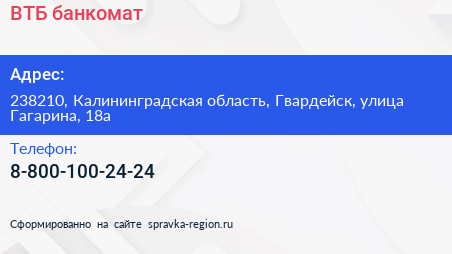 ВТБ, банкомат по адресу 238210, Калининградская область, Гвардейск, улица Гагарина, 18а в дальнейшем Организация, размещена в следующих категориях: