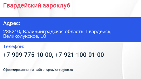 Гвардейский, аэроклуб по адресу 238210, Калининградская область, Гвардейск, Великолукское, 10 в дальнейшем Организация, размещена в следующих категориях: