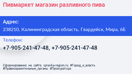 Пивмаркет, магазин разливного пива по адресу 238210, Калининградская область, Гвардейск, Мира, 6Б в дальнейшем Организация, размещена в следующих категориях: